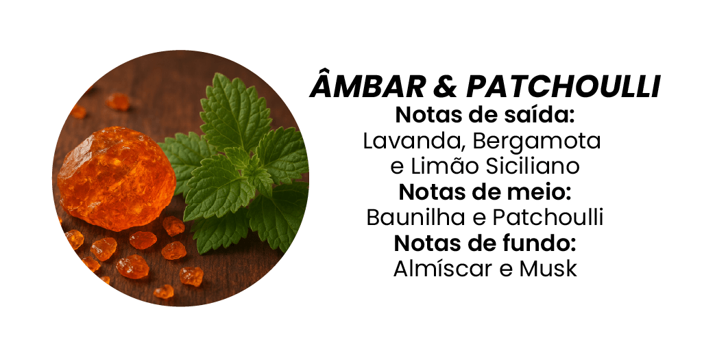 O aroma de Âmbar & Patchoulli envolve o ambiente com notas quentes e profundas, despertando aconchego, sofisticação e uma sensação de equilíbrio interior.