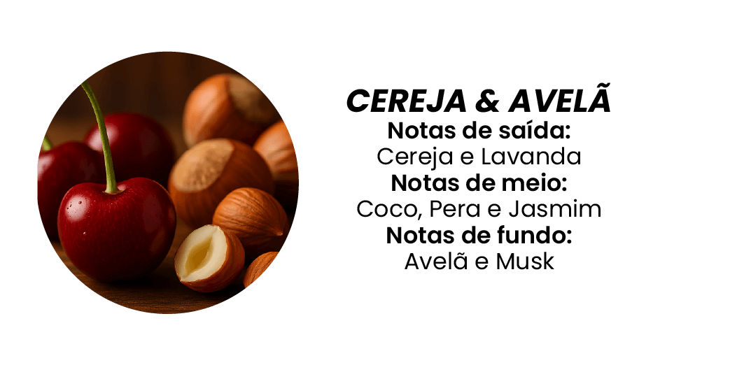 O aroma de Cereja & Avelã combina doçura e cremosidade, criando uma fragrância envolvente que desperta conforto, acolhimento e prazer.